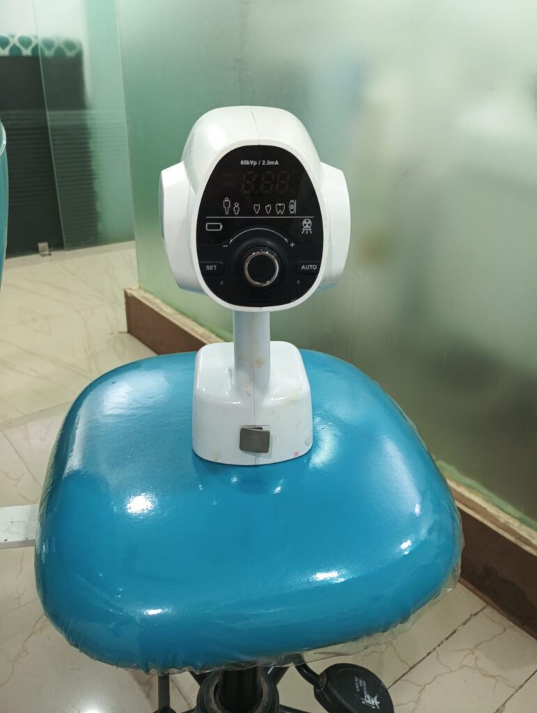 A handheld digital X-ray unit (often used with RVG sensors) that captures high-quality intraoral images quickly and with minimal radiation. It helps our team make fast, accurate diagnoses and plan treatments like root canals and implants with greater precision—while keeping the patient comfortable.